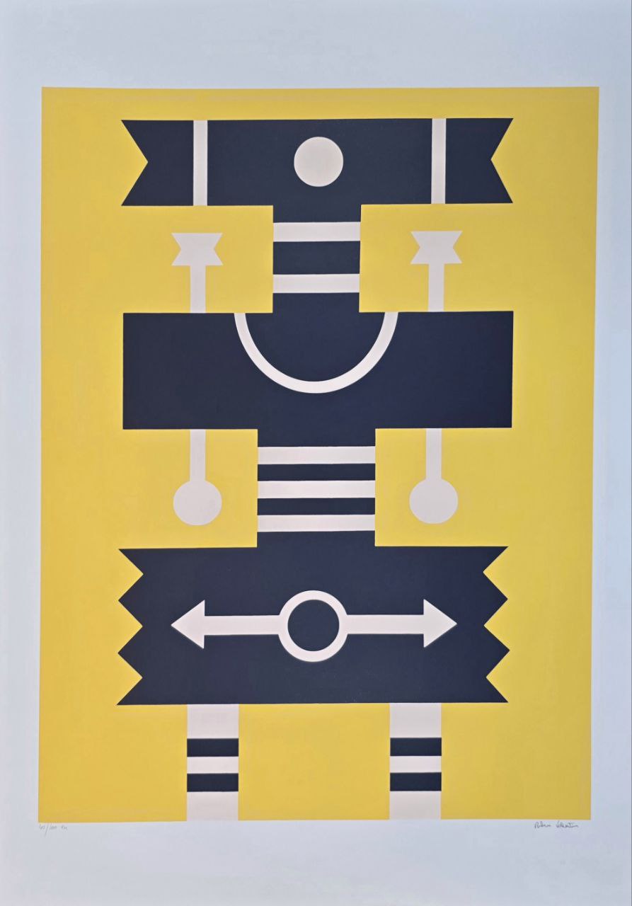 Gravura assinada abstrato azul, branco e fundo amarelo Rubem Valentim 65/100 100 x 70