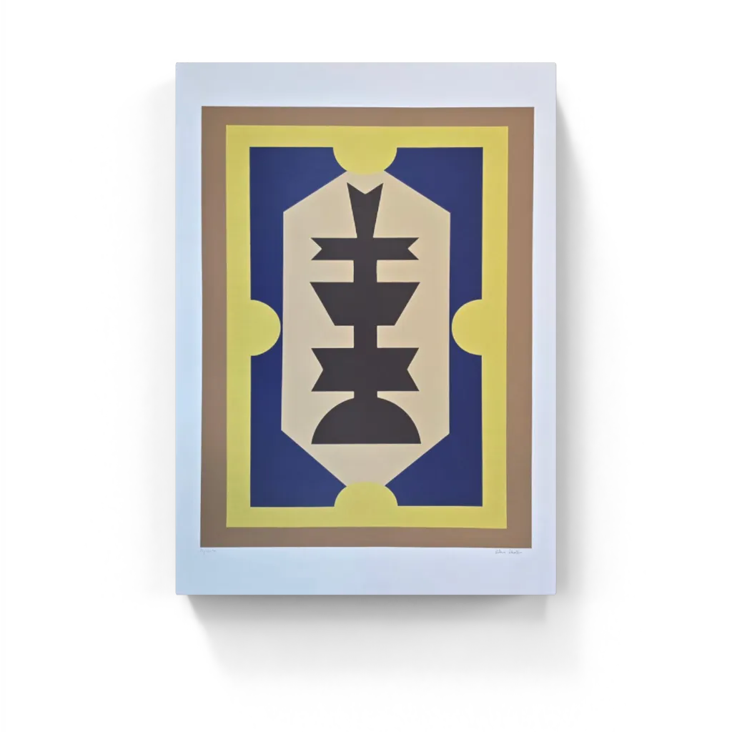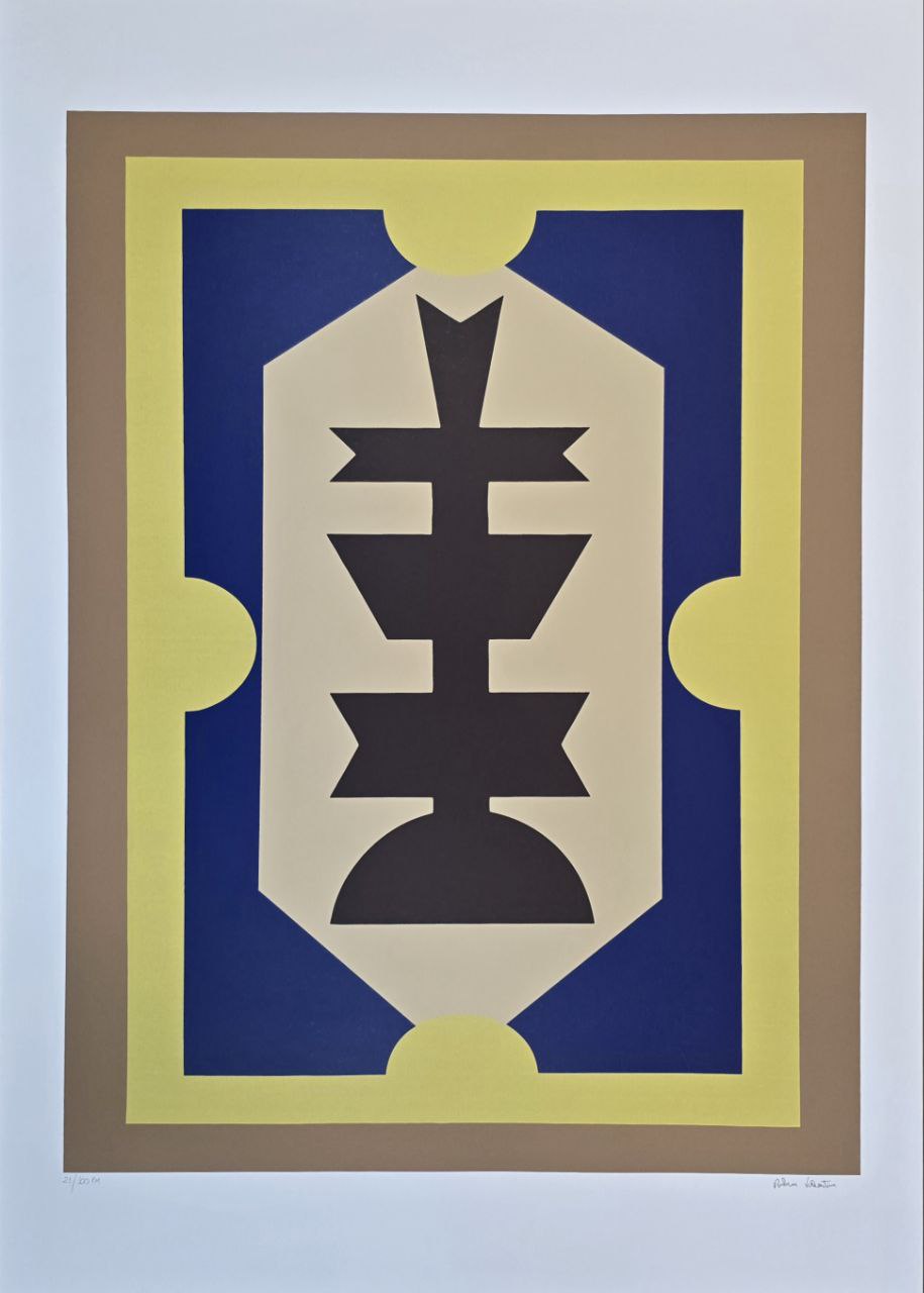 Gravura assinada abstrato azul, marrom e fundo amarelo Rubem Valentim 21/100PM 100 x 70