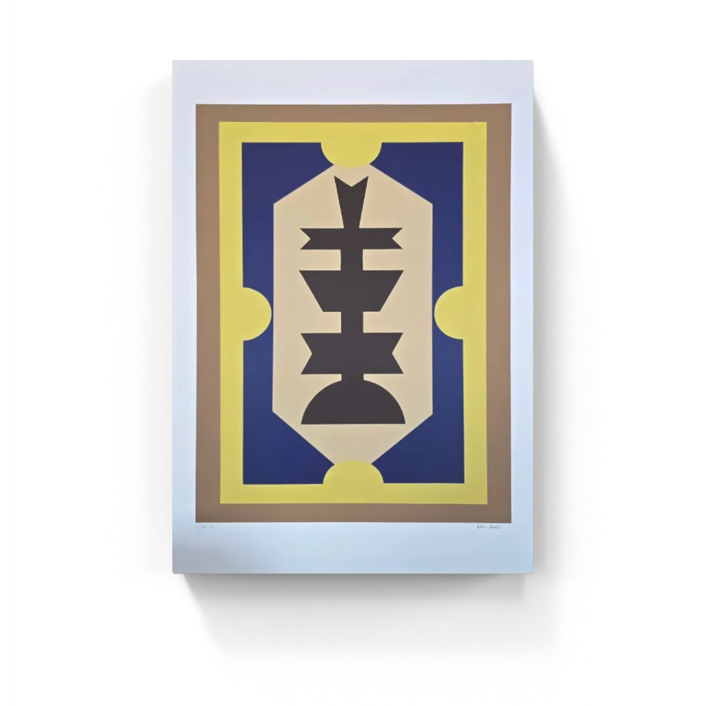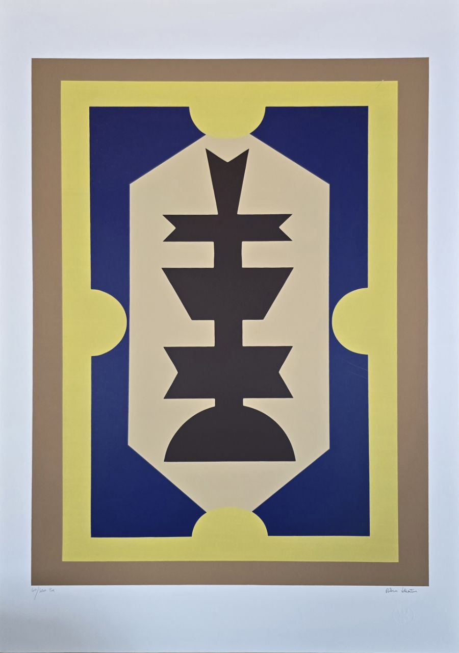 Gravura assinada abstrato azul, marrom e fundo amarelo Rubem Valentim 60/100PM 100 x 70